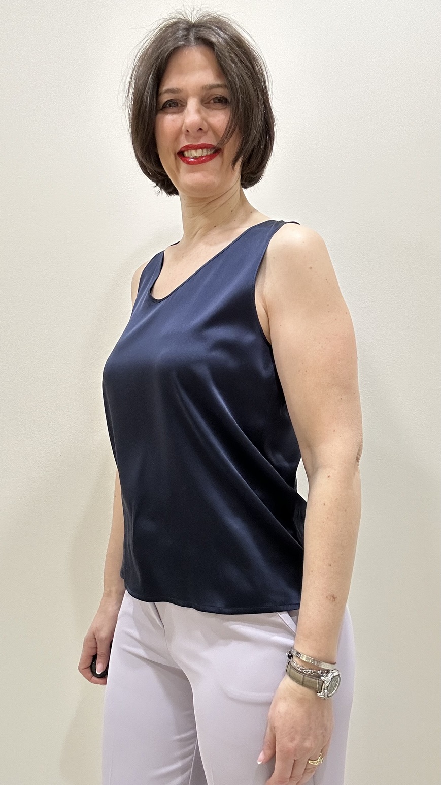 Top da donna realizzato in raso di seta stretch, luminoso e fluido. Le linee diritte e la vestibilità regolare definiscono una silhouette essenziale ed elegante.